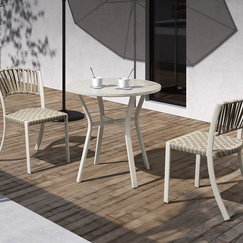 The table features a lightweight metal frame with a marble-textured tabletop, and the chairs are made with a matching metal frame and interwoven ribbons for the seat and back.