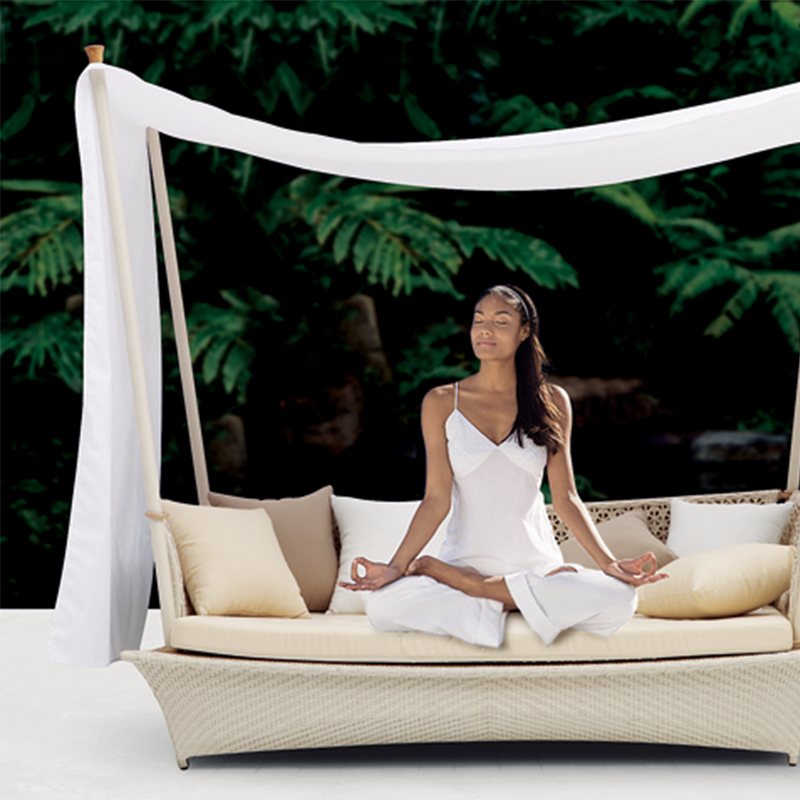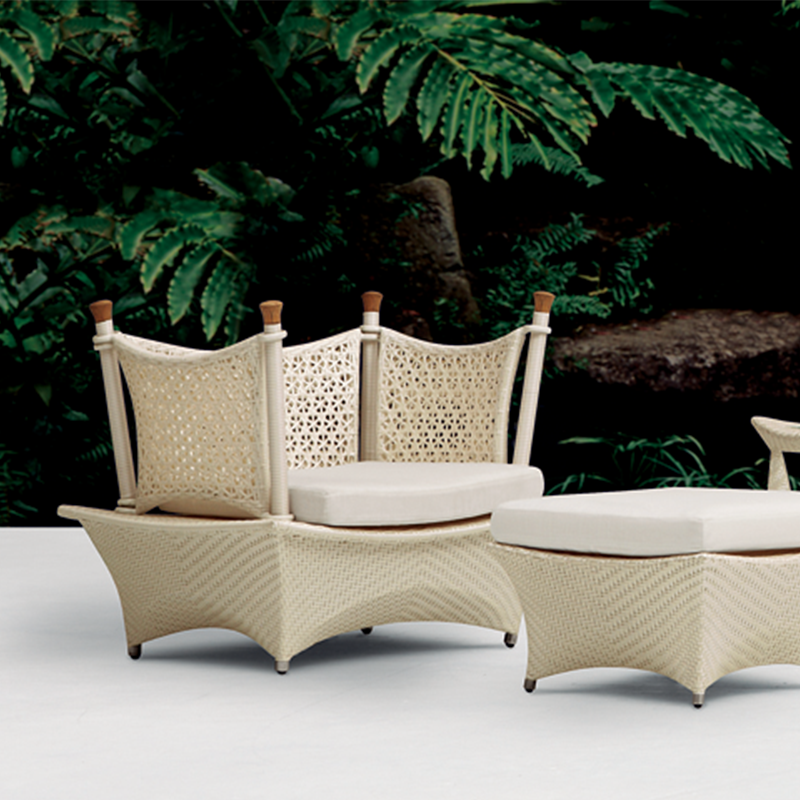 Perfect for gardens or terraces, this sofa seamlessly merges traditional craftsmanship with contemporary elegance, creating a standout piece that invites relaxation and complements any outdoor setting.