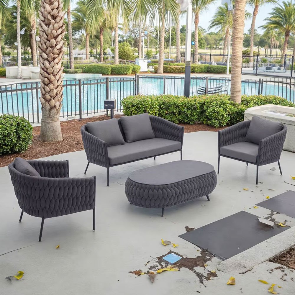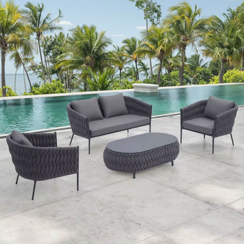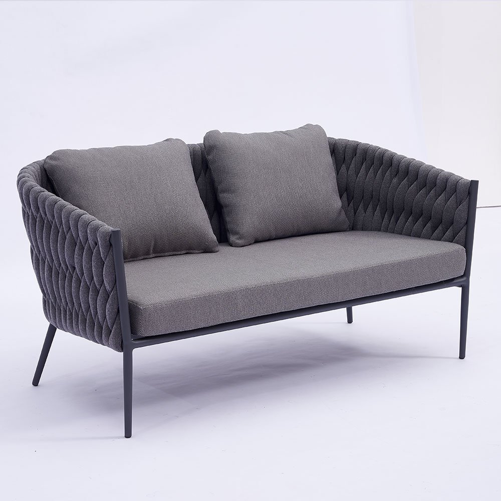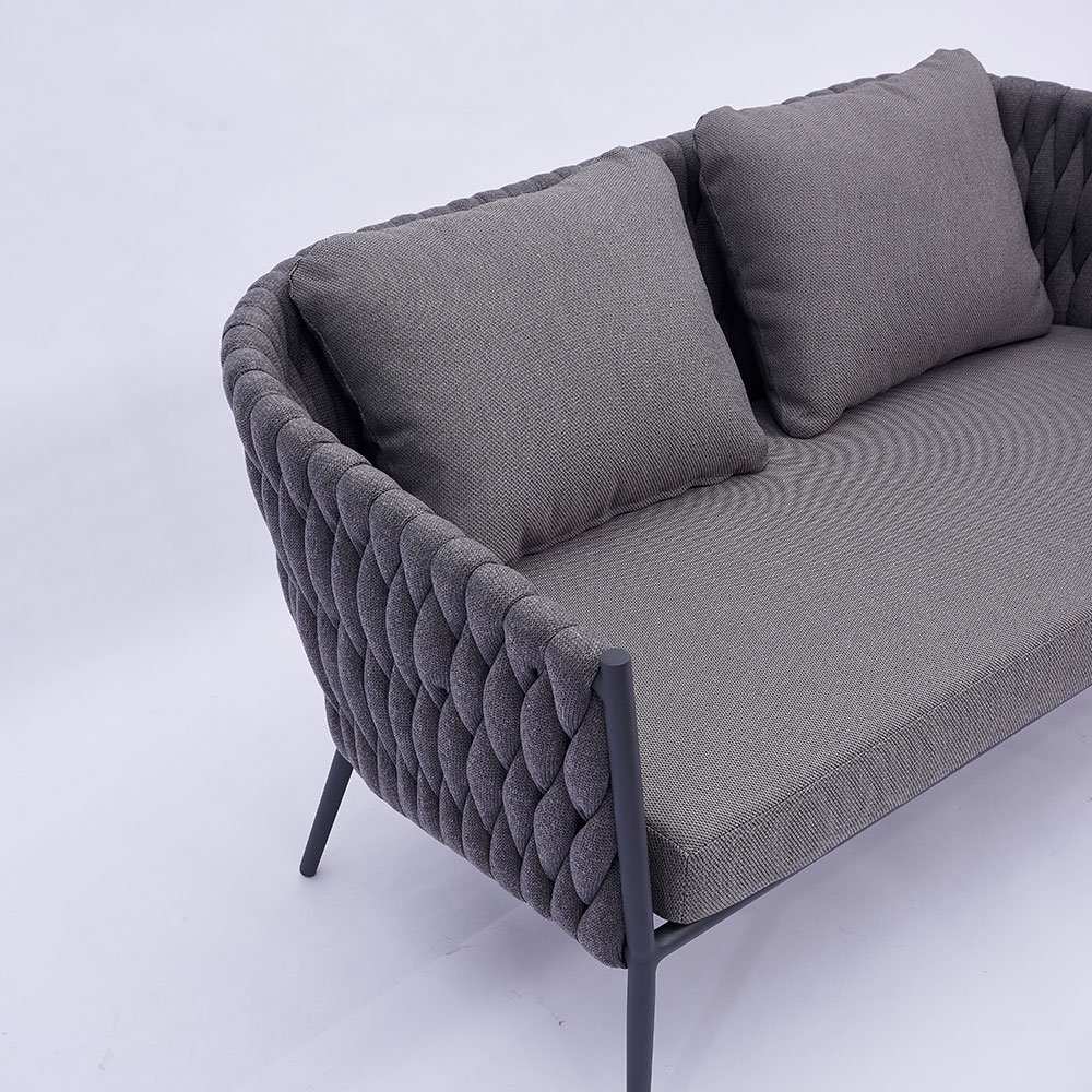 With its clean lines, aluminum alloy framework, and handmade rope weaving, this garden sofa set is a sleek, modern addition to any outdoor space. The combination of materials provides a balance of sophistication and durability, seamlessly complementing any garden, terrace, or patio.