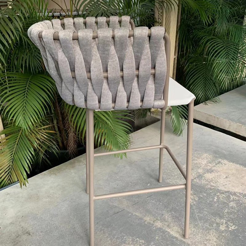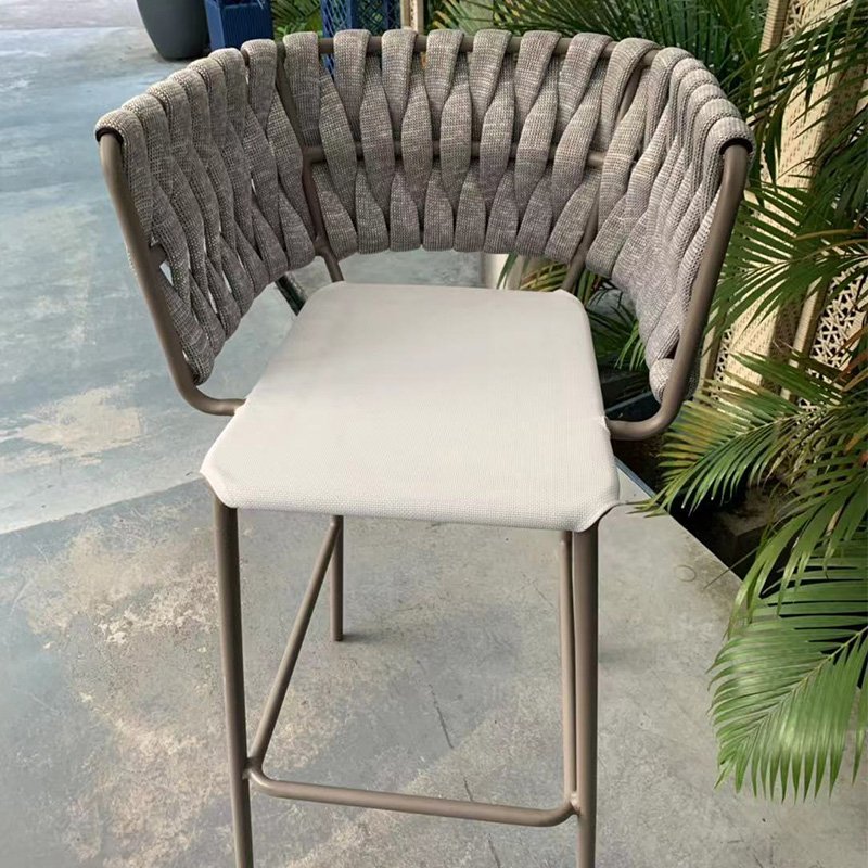 The Chair Rope features a unique woven gray back, sturdy metal frame, and soft white cushion. Perfect for modern spaces, it offers durability and comfort indoors or outdoors—making it a standout piece in any setting.