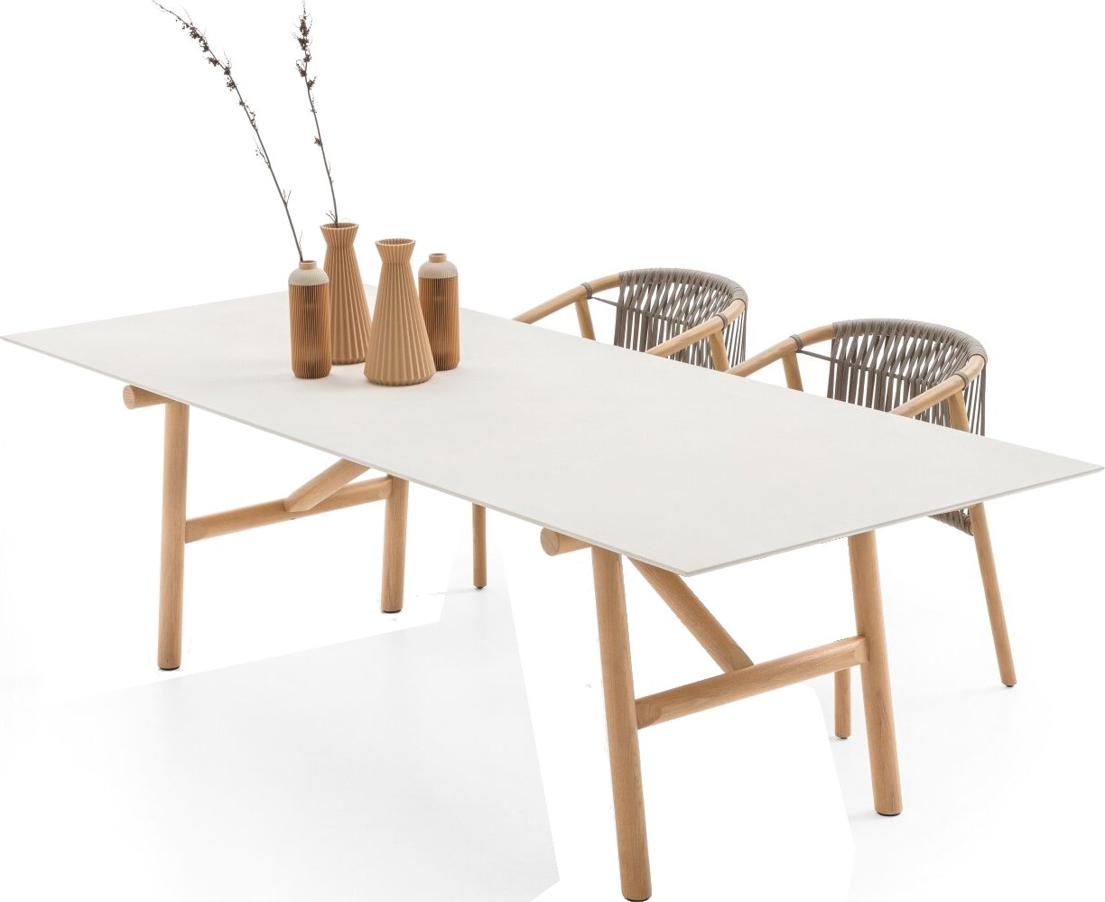 The Dining Room Table Teak features a large, pure white countertop, visually simple and atmospheric, providing ample space for dining or storage. The legs of the table are made of solid wood in natural wood color, with a unique cross structure design that ensures stability and gives the overall neat geometric beauty. The overall style is versatile and stylish, making it easy to integrate into various scenes such as modern homes and outdoor courtyards.