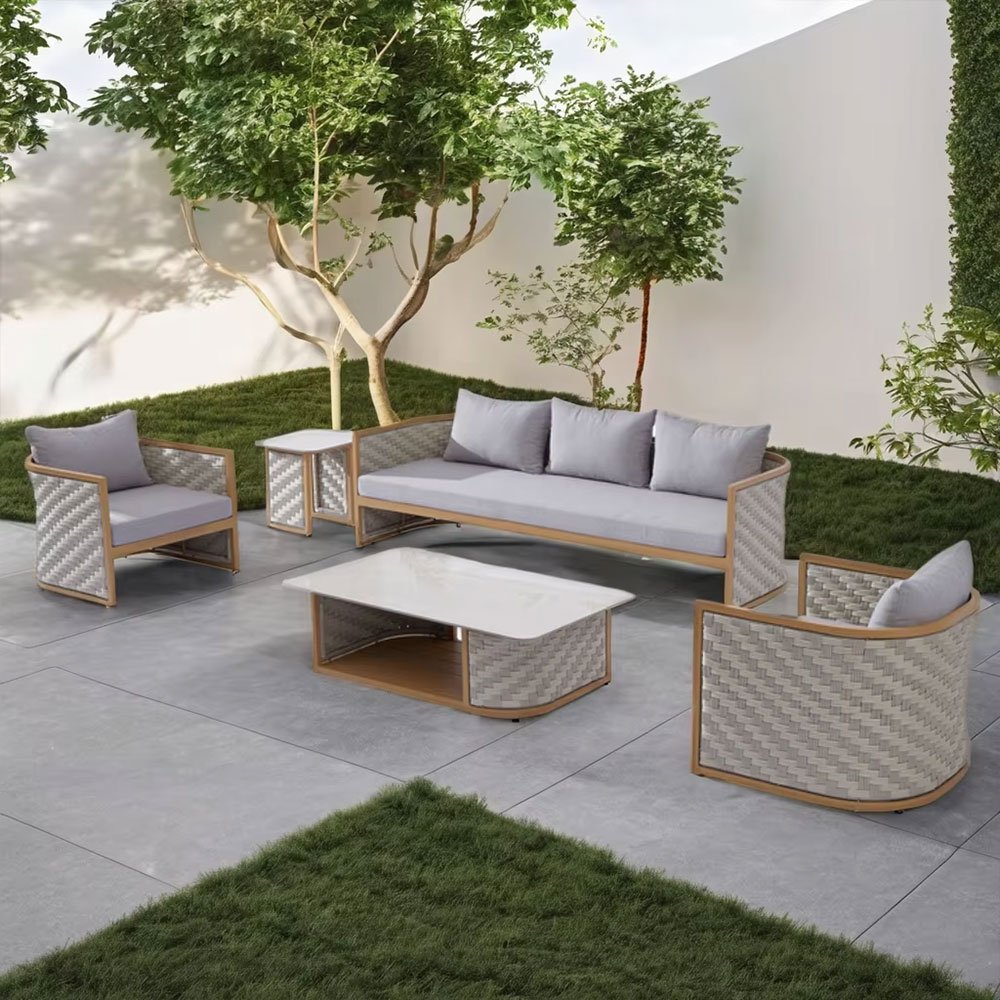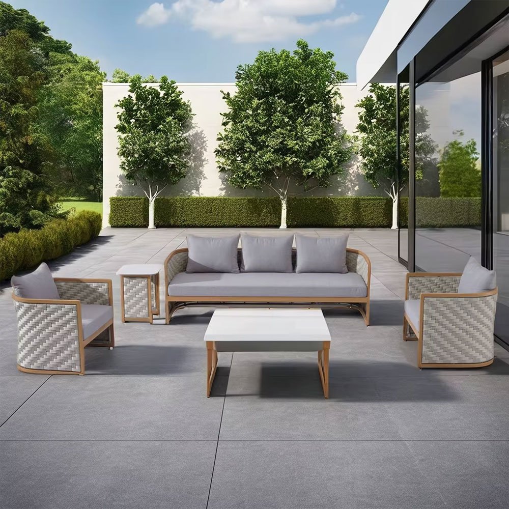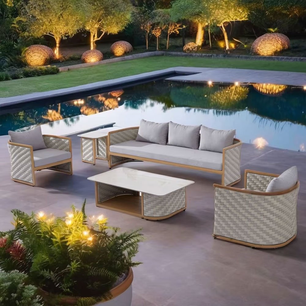 Enhance your outdoor living area with the Garden Sofa and Table Set by Outdoor Whale. This stunning set includes a Single Sofa, a Three-Seat Sofa, a Coffee Table, and a Side Table, designed to bring together comfort, elegance, and durability. Perfect for patios, gardens, or terraces, this set combines a robust aluminum alloy powder-coated frame, intricate handmade rope weaving, and a sintered stone tabletop to create a sophisticated and long-lasting outdoor furniture solution.