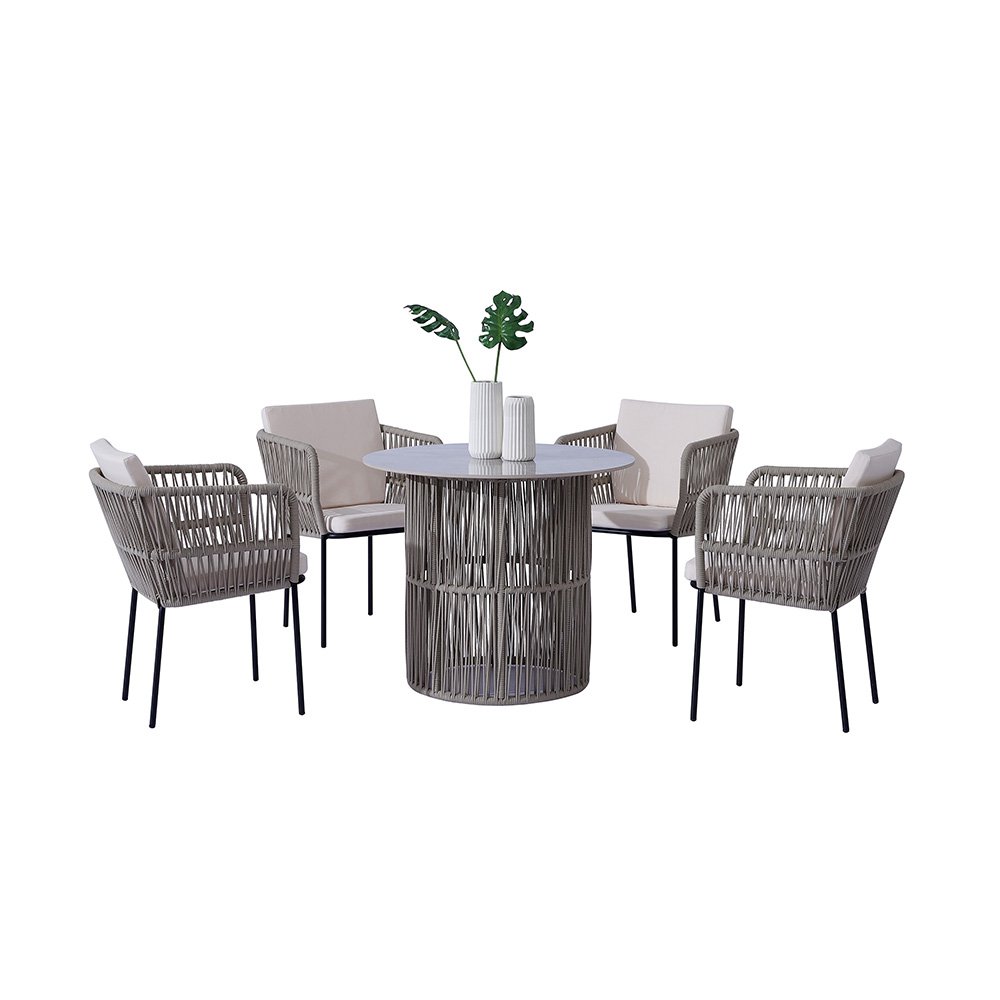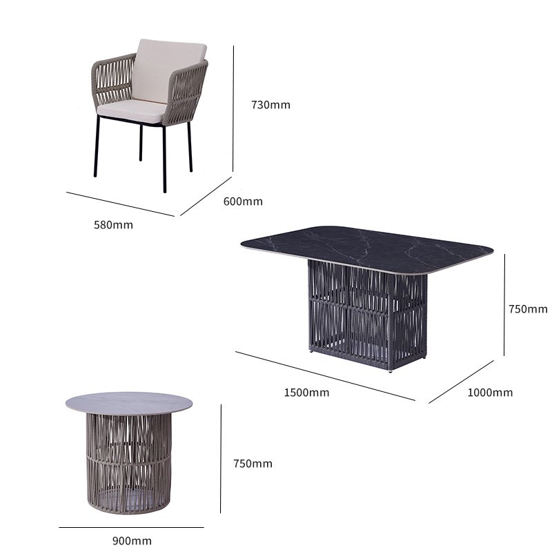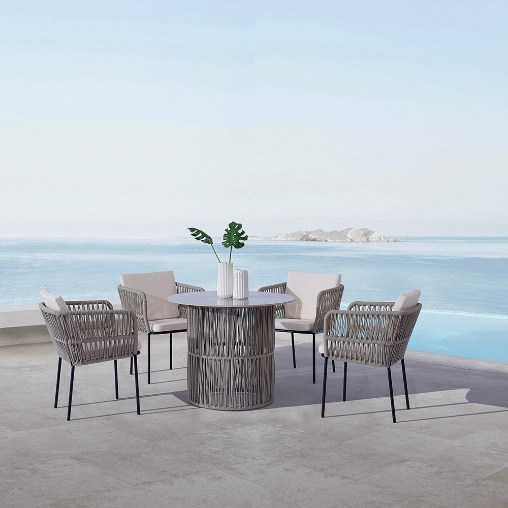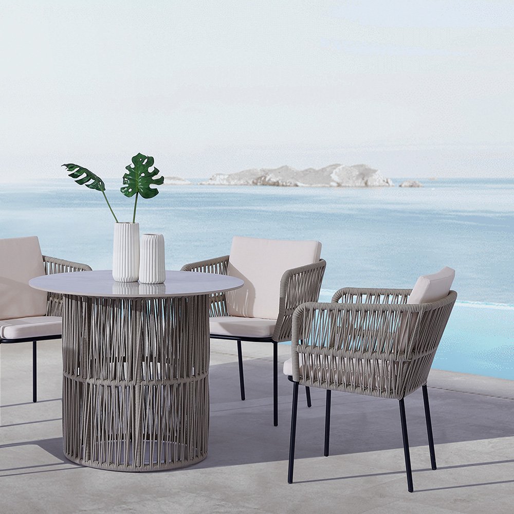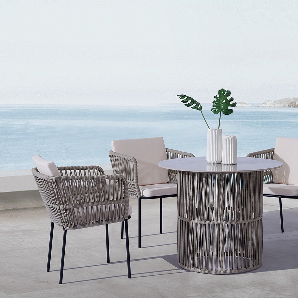Pair this stunning Marble Dining Table with our Outdoor Modern Chairs to create a cohesive dining experience. The rope-style design of both the table and chairs ensures a unified look that adds charm to any setting.