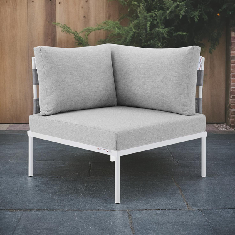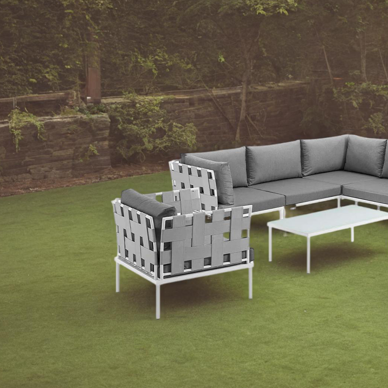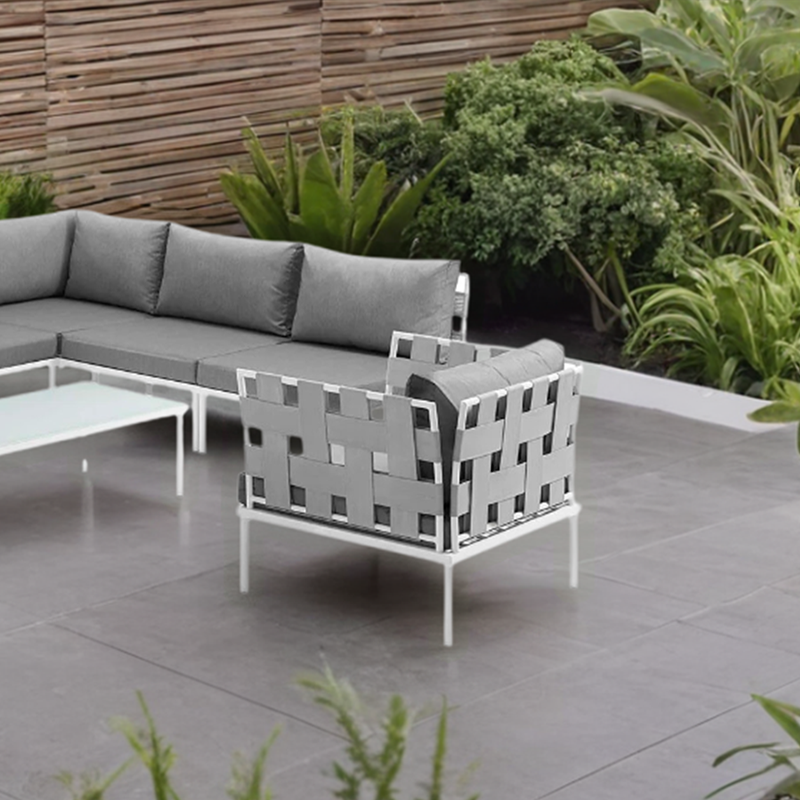 The Outdoor Corner Sofa features a lightweight aluminum frame with quick-drying cotton cushions and waterproof sunny cloth covers. Perfect for outdoor relaxation, it offers moisture resistance and lasting comfort on patios, gardens, or terraces.