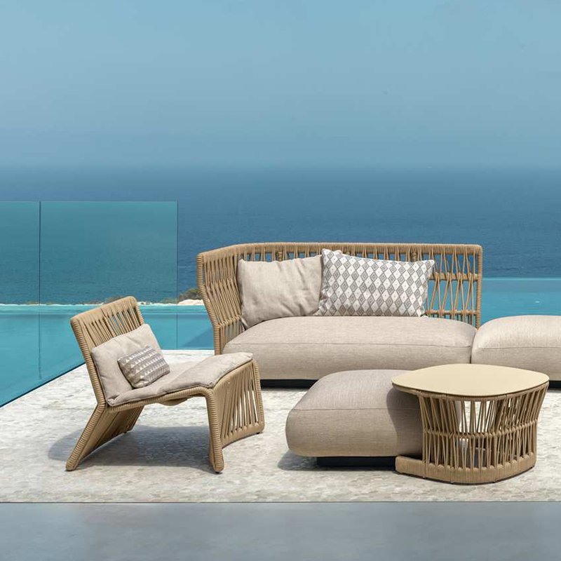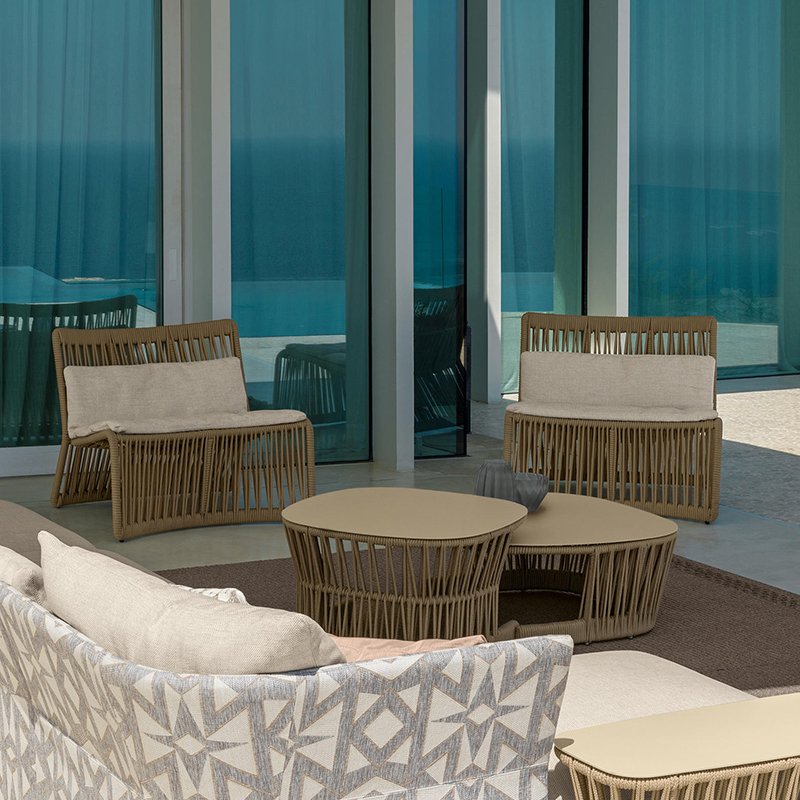 Elevate outdoor living with our Outdoor Leisure Chairs, featuring a braided hawser-wrapped steel frame and cheerful, slim cushioning. The design blends durability, artistic flair, and comfort, making it a standout choice for vibrant patio settings.