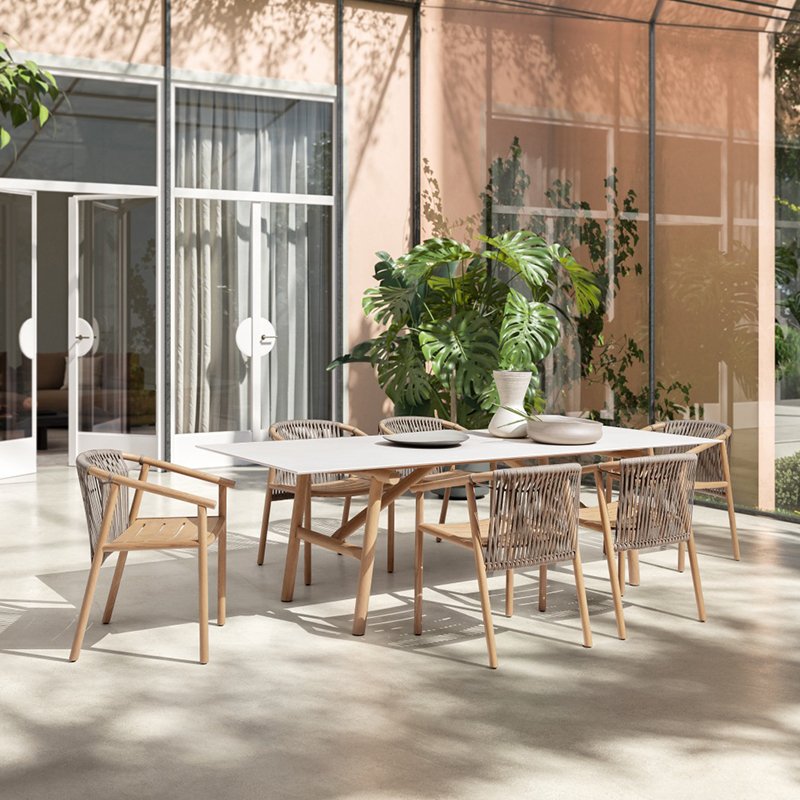The contrast of solid frames and mesh upholstery introduces a refined texture and visual depth, ideal for terraces, patios, and modern garden settings.