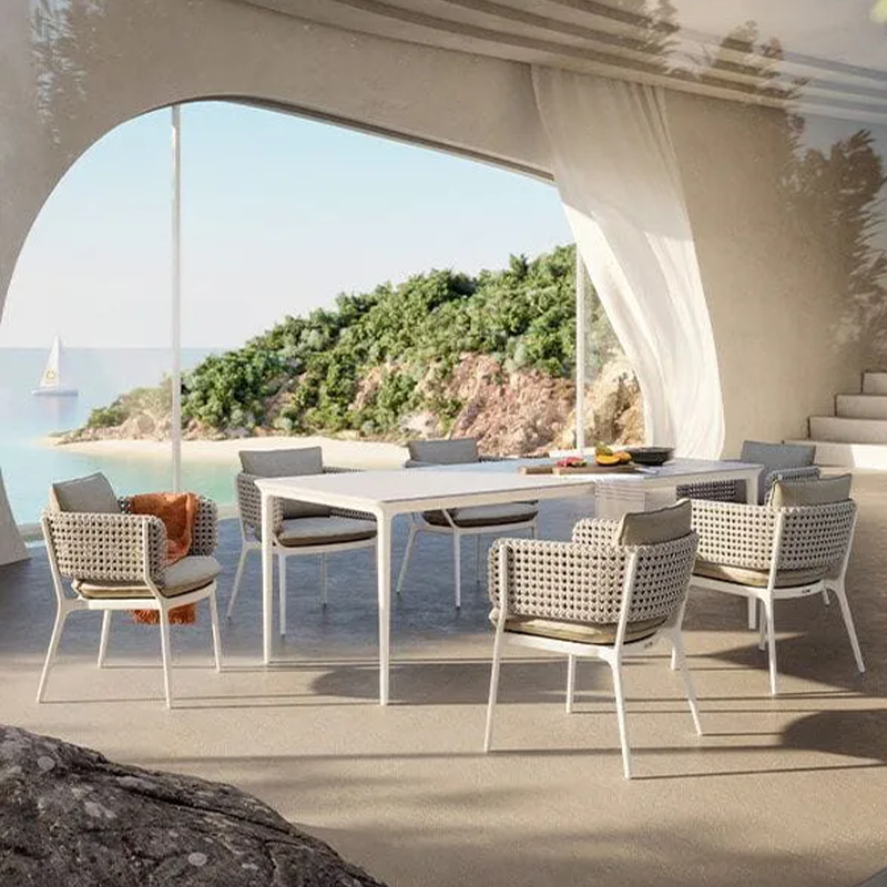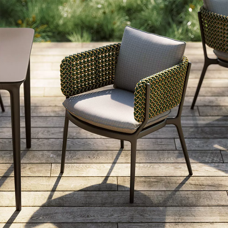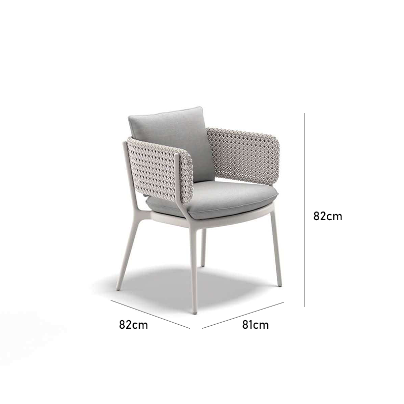 Inspired by modern minimalist design, this Outdoor Dining Rope Chair seamlessly blends comfort and functionality. The innovative use of braided ropes and a powder-coated aluminum frame ensures durability and style. The seat cushion, made from quick-drying cotton and waterproof acrylic fabric, highlights the easy maintenance and resilience required for outdoor furniture.