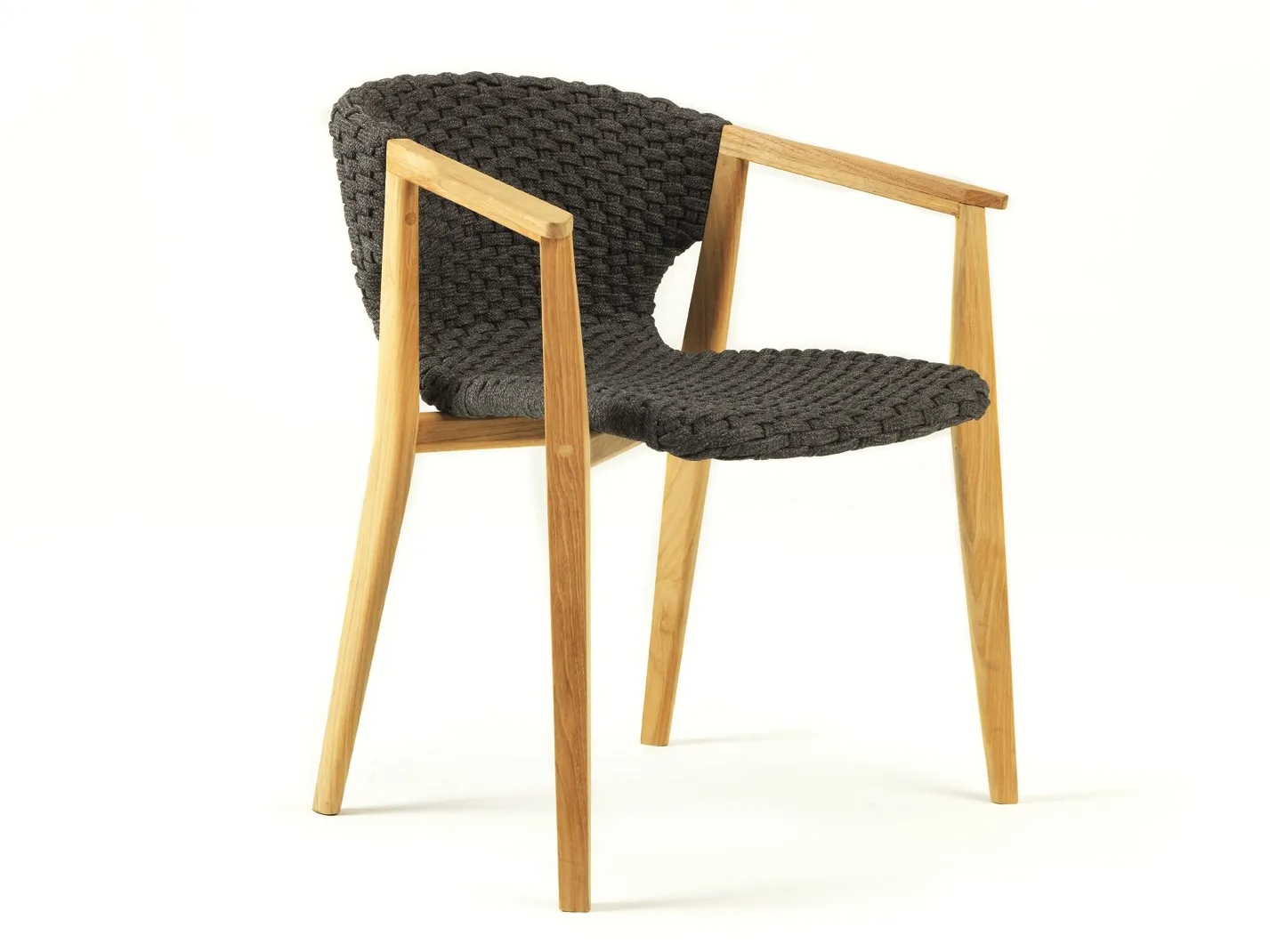The Outdoor Teak Chair combines ergonomic design with high-quality teak wood and woven rope, creating a stylish and durable seating option. With pickled teak and light gray rope, it offers a fresh, contemporary look for any outdoor area.