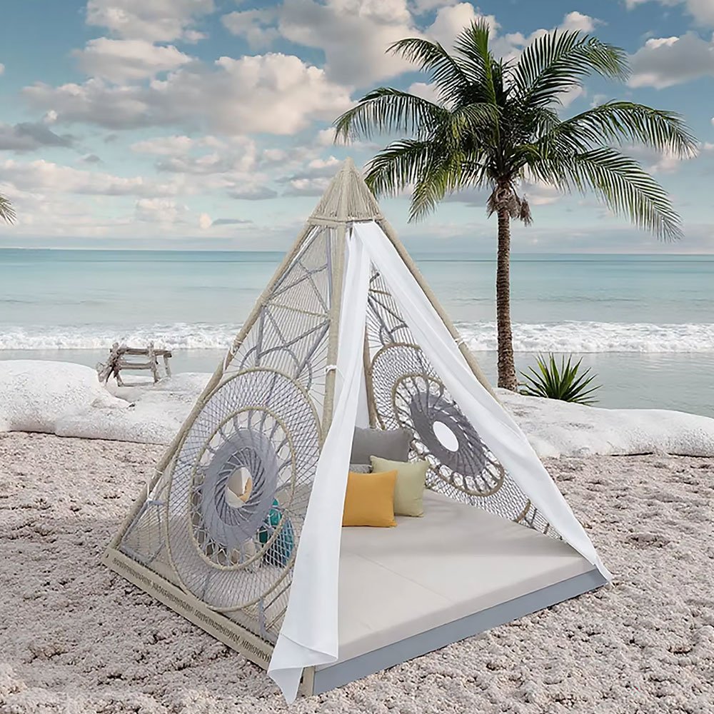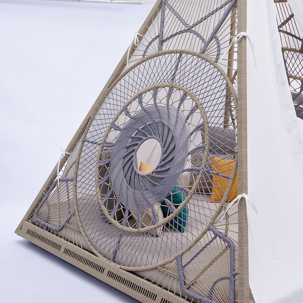 The Outdoor Tent Bed combines modern elegance with practical design. Its aluminum alloy frame, handmade rope weaving, and plush cushions create an inviting space that blends seamlessly into any garden, patio, poolside, or balcony. The unique tent design provides shade while maintaining an airy and spacious feel.