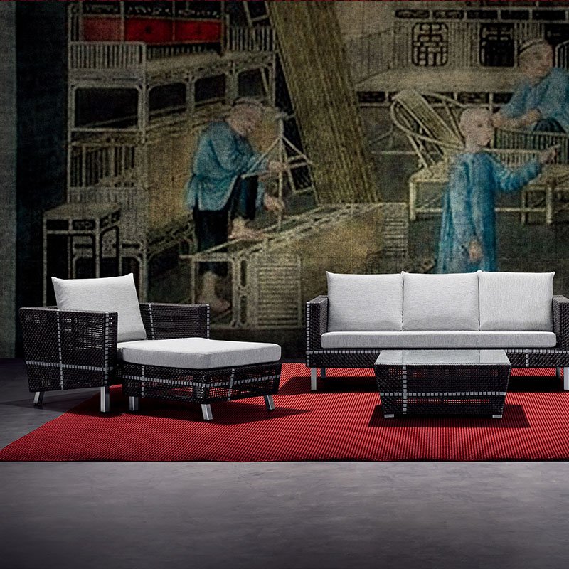 Yes, the sofa is made of durable dark woven rattan, designed to withstand outdoor conditions and maintain its modern aesthetic.