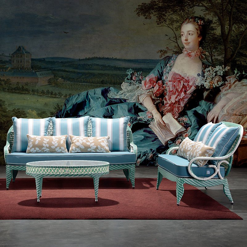Enhance your rattan large sofa collection with this elegant outdoor loveseat! Its refined metal frame and woven design, adorned with retro details, add charming style. Thick blue and colorful cushions provide exceptional comfort, making it perfect for enjoying quality outdoor time with family and friends.