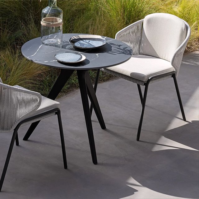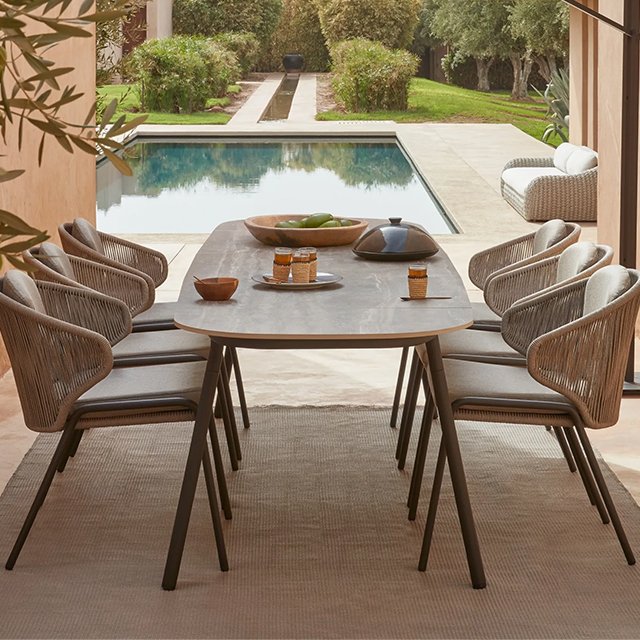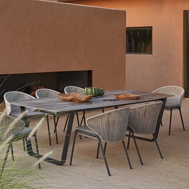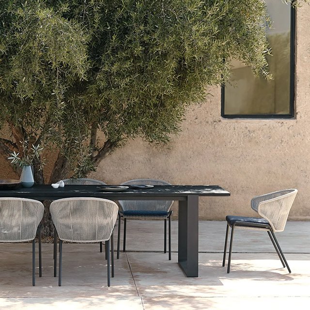 The Rope Dining Chairs offer a blend of modern design and classic elegance, featuring wrap-around rope backrests and armrests that create a sleek, open look. Designed to bring moments of warmth and intimacy to your outdoor dining space, these chairs can be left sleek for minimalist appeal or paired with optional backrest cushions for added comfort during extended gatherings. Their versatility and style make them an ideal choice for both intimate dinners and lively outdoor entertaining.