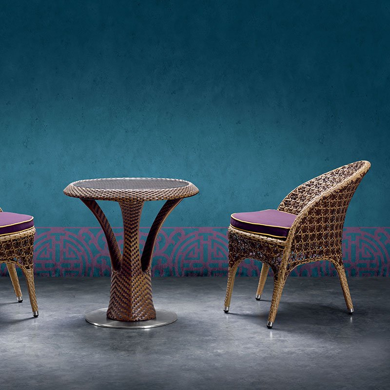 Enhance your patio with our round outdoor table! Featuring a sleek grey top and an elegantly curved brown woven support, it’s both durable and stylish. A stable silver base completes this modern piece, perfect for any al fresco setting.