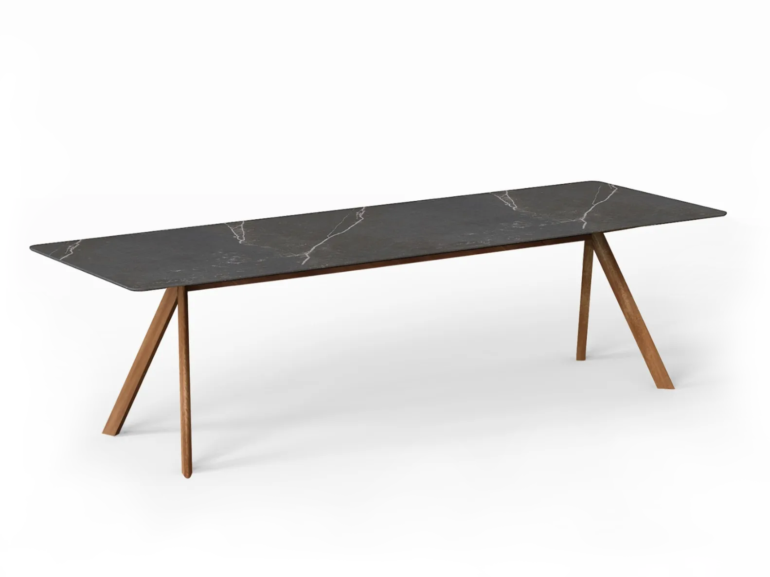 This Sintered Stone Dining Table for 8 features a dark grey rock slab as the tabletop, with natural white textures embellished like artistic brushstrokes, giving it a premium texture and unique charm. The intered stone dining table is paired with wooden triangular brackets, with simple and neat lines that combine stability and design sense. The overall style cleverly blends the coolness of modern stone with the warmth of solid wood.