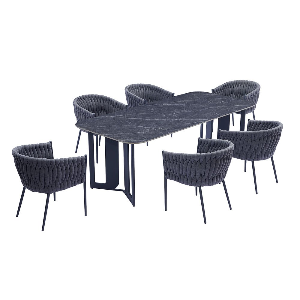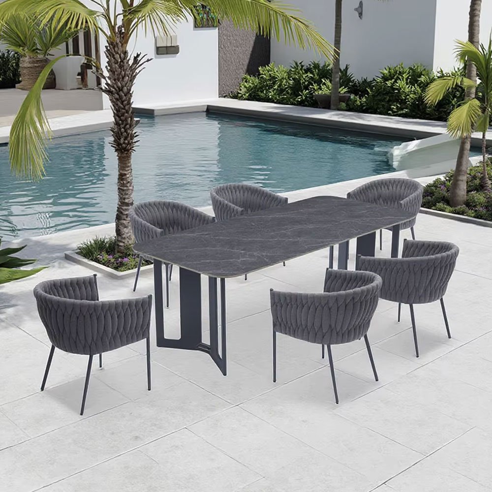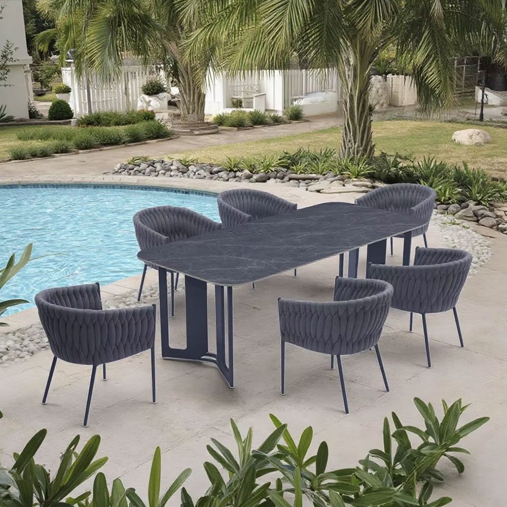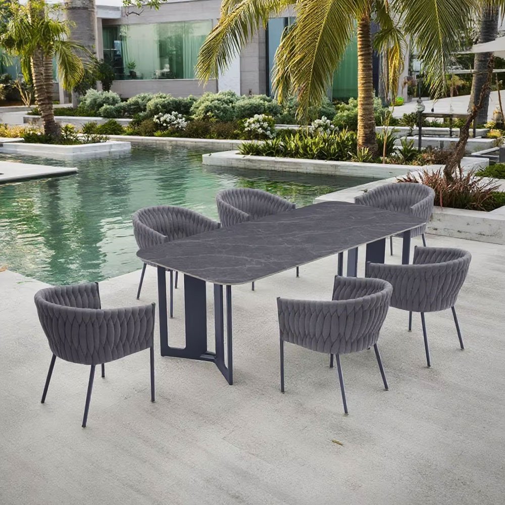 The centerpiece of the dining set is the sintered stone tabletop, known for its superior durability, heat resistance, and scratch-resistant properties. This premium material is perfect for outdoor dining, offering both beauty and practicality. The sintered stone surface is easy to clean and maintain, making it ideal for casual outdoor meals or formal gatherings.