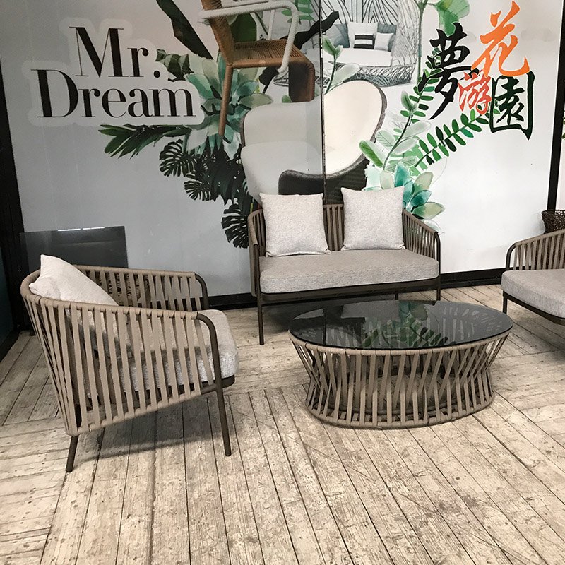 This outdoor sofa chair attracts people with its modern and stylish design and comfortable sitting feel. The chair frame is made of metal, ensuring it is durable and adaptable to various outdoor environments. The chair back and armrests are designed with gray weave, which increases the overall beauty and breathability. The seat cushions and back cushions are made of green fabric, which adds a fresh and natural color to the sofa, and the yellow cushion in the middle adds a bright embellishment.