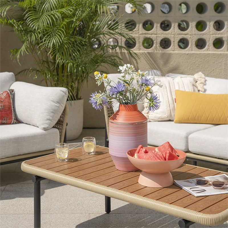 Add a touch of elegance and natural beauty to your outdoor space with the Teak Outdoor Table. Crafted from high-quality teak wood, this table exudes timeless charm while offering exceptional durability. Its wicker-wrapped edges introduce a refined, laid-back sophistication, perfect for enhancing your alfresco lounging experience. Whether you’re hosting a dinner party on the patio or enjoying a quiet moment in your garden, this table is the ideal choice for those who appreciate the finer things in life.
