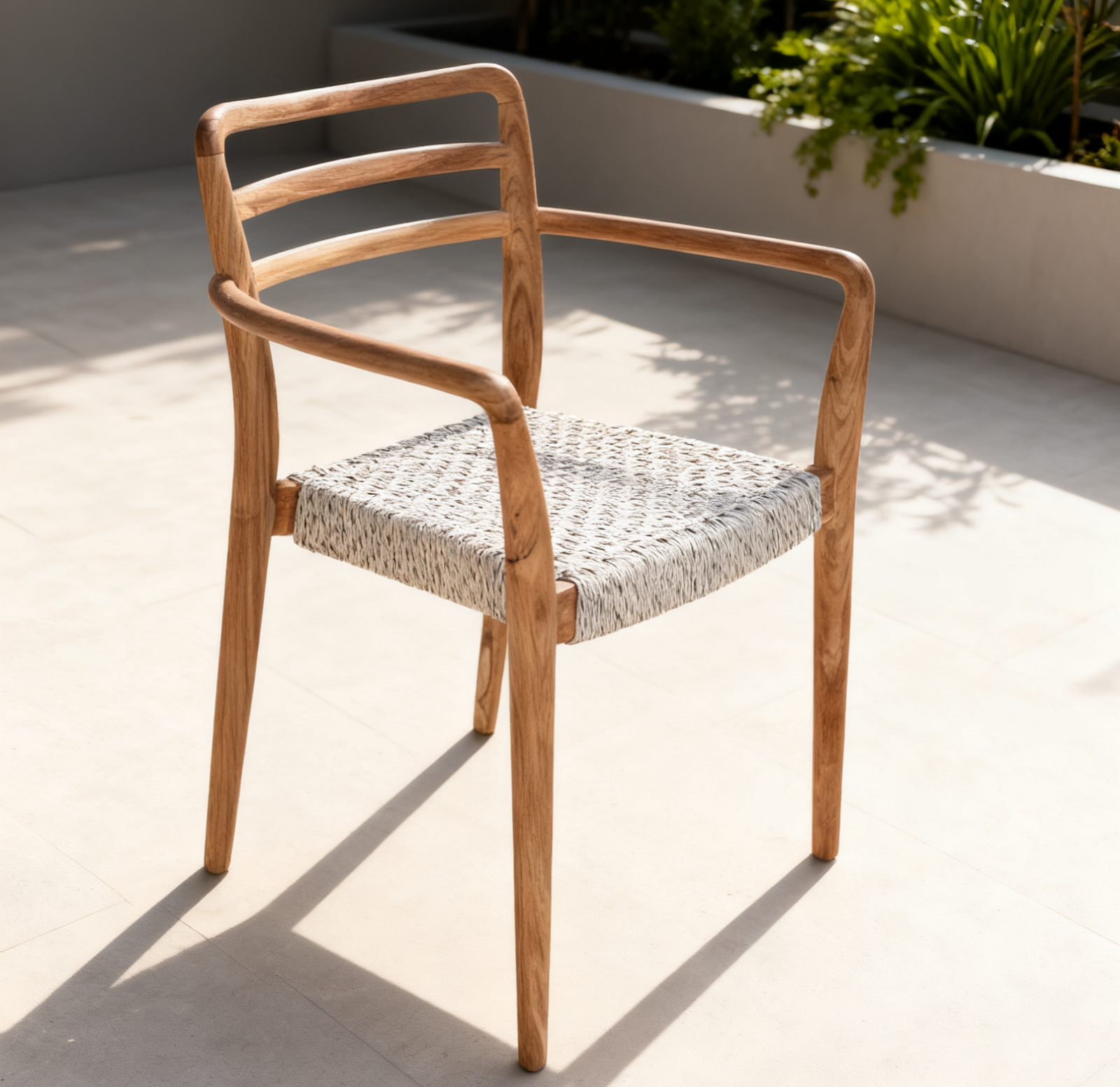 This Teak Rope Chair is a clever fusion of nature and design, with a solid wood frame wrapped in natural textures, showcasing a simple and atmospheric style; The woven seat surface is delicate and breathable, injecting handmade temperature into the space. The smooth curved armrests and backrests fit the human body, and the simple lines are suitable for various style scenes. Whether it is home dining or commercial leisure spaces, they can interpret a comfortable and fashionable lifestyle aesthetic with their elegant texture.